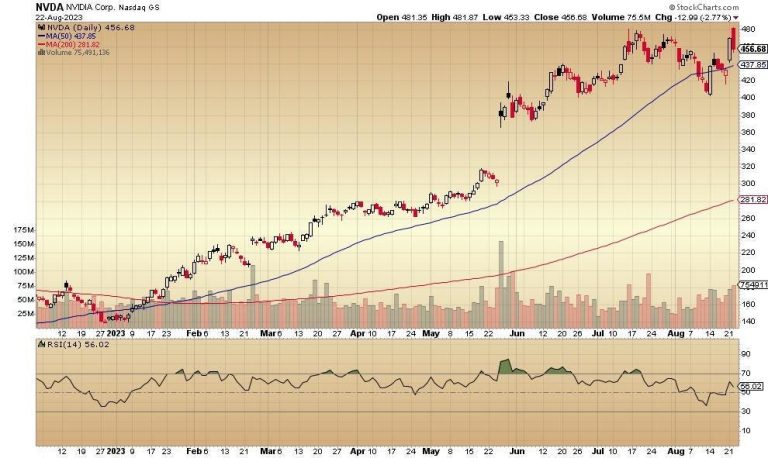 So, NVIDIA hits a higher high which is then called into question during the rest of the session. If earnings come in at a less than expected level, there might be issues. In the meantime, the stock continues to trade above its 50-day moving average (the blue line) and its 200-day moving average, generally a bullish look.