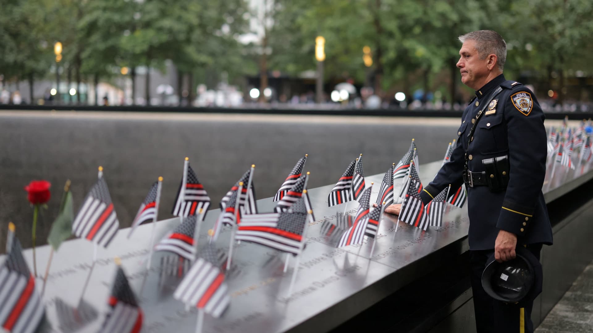 A member of the military attends services at the National September 11 Memorial in New York