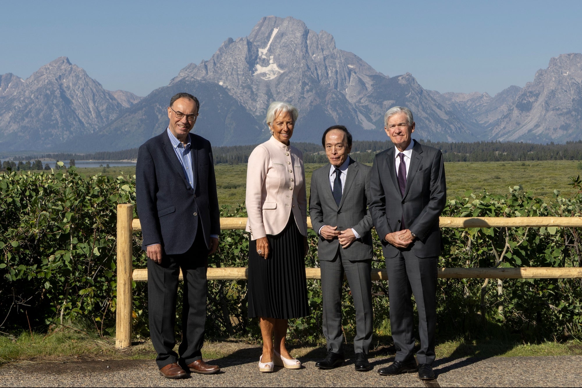Federal Reserve Chairman Jerome Powell (R) is seen with Bank of Japan Governor Kazuo Ueda (2nd R), European Central Bank Governor Christine Lagarde (2nd L), and Governor of the Bank of England Andrew Bailey (L) in Grand Teton National Park on August 22, 2025, near Jackson Hole, Wyoming. (Natalie Behring | Getty Images)